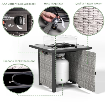 ¡¾Durable construction¡¿: The outdoor firepit is constructed of premium quality solid steel frame and the burner is made of stainless steel, making the patio fire pit built to last and withstand all types of weather conditions. This gas firepit has beautiful tempered glass tabletop which has naturally formed lines, provides a sturdy safe surface for food and drinks and is easy to clean, it can match various of patio furniture and dress up your yard graceful.¡¾Perfect Size, Optimal Heat Output¡¿: Measuring at 27.6 “D x 27.6 “W x 24.8 “H, this propane fire pit table is perfectly sized for various outdoor spaces. Outdoor Fireplace with a remarkable 50,000 BTUs of heat output, fire pit table guarantees cozy warmth during chilly evenings and nights. Enjoy the beauty of the flames while staying comfortably warm in your outdoor haven.¡¾Safe and Stable Design¡¿: Safety is paramount, and Furnivilla ensures fire pit table with thoughtful features. propane fire pit table with a pull ring makes it easy to access the side door for propane tank placement, while a stainless steel ring secures the tank in place, preventing any tilting during use. Enhanced support legs provide stability, ensuring your outdoor fire pit stands firm, making it both safe and easy to relocate.¡¾Effortless Assembly & Premium Support¡¿: Unveil the refinement as you unbox the firepit table for outside, accompanied by clear instructions and all the essential hardware, ensuring a smooth and speedy assembly process. Any queries about your new table fire pit? Our dedicated team is here to provide prompt responses and robust solutions. Your satisfaction with patio firepit table is our top priority.
