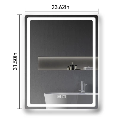 23*31 LED Lighted Bathroom Wall Mounted Mirror with High Lumen+Anti-Fog Separately Controlbedroom full-length mirror bathroom led mirror hair salon mirrorProduct InformationMain ColorMatte WhiteMain MaterialAluminiumAssembled Length (in.)23.62Assembled Width (in.)31.49Assembled Height (in.)0.15Weight (lbs)9.24Package InformationPackage Length (in.)26.77Package Width (in.)34.64Package Height (in.)4.33Package Weight (lbs)12.32InstallationInstallation Special Designed Assembling Brackets, Easy for Installation. Flush mount to a wall, easy and seamless. Mounting bracket system makes installation effortless. Mounting hardware included. See installation instructions below for more information. Professional Customer Service. Constantly improving our packaging to ensure our mirrors arrive safe. We have expert customer service team standby . to support, contact us for product specification, warranty or before making a return, we promise to offer a satisfying . solution to all your needs.One button:on/off/ heaterSingle button control, safe and energy-saving,Meanwhile, clear the steam on the mirror in 60 seconds, no need to worry about the foggy anytime High Quality Water Proof LED Belts,life time :50,000 hours (Using the mirror 3 hours a day means it will last 45 YEARS).Button life time 100000 times