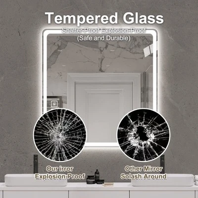 Strong anti-oxidation performance, corrosion resistance is not easy to blackenTested, in five percent concentration of hydrochloric acid, more than 95 hours to react (ordinary copper-free silver mirror less than 30 hours to react) antioxidant performance than the traditional copper-free silver mirror to enhance the three times, is the ordinary silver mirror 9 times, aluminium mirrors 27 times, the mirror surface is more translucent. Multi-layer protection, more durable.Upgraded Aluminium Optical LampshadeThe structure is safer than ordinary ones, constant voltage will not flash frequently, and the overall light effect is more three-dimensional.Comparison of light and open state, clear texture, layered, soft light.Anti-blast film on the backExplosion-proof glass brings you a sense of security, even if the cracked glass will not splash.Smart touch and One-touch defoggingTens of thousands of sensitive touch tests.Can be touched with wet hands.The defogging function ensures that the mirrors do not fog up and remain clear.
