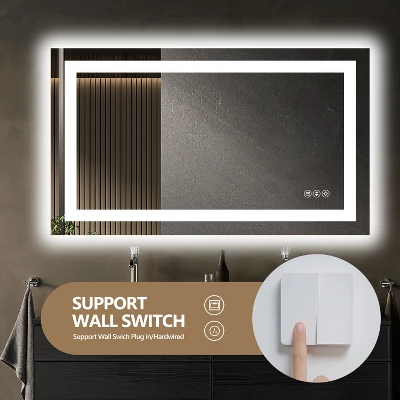 [Dimmable]: Long-press the power button to adjust brightness from 10% to 100%. Short-press the color temperature button to select 3000K warm white, 4500K neutral white, or 6000K daylight.[Unique Design]: Integrated mirror power switch and anti-fog button. The built-in anti-fog function eliminates the need for constant de-misting sprays. Anti-fog mode automatically shuts off after 1 hour for energy efficiency and safety.[Wall Switch Compatibility]: The wall switch can directly control the light and anti-fog functions. When power is restored via the wall switch after shutdown, the mirror resumes its last-used settings.[Safe & Durable]: UL-certified components with protective casing. LED lifespan: 50,000+ hours (45+ years at 3 hours daily use). Copper-free silver mirror with far lower corrosion rates than standard mirrors. Features 5mm tempered glass for shatterproof, explosion-resistant, and long-lasting safety.[Easy Installation & Packaging]: Improved packaging minimizes transport damage. Passed rigorous tests including drop, impact, high-voltage, and insulation tests. Includes mounting screws for effortless installation.Product Highlights