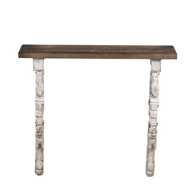 - The solid fir top features a natural sense of warmth while the body catches the eye with decorative scrollwork in a distressed white finish.