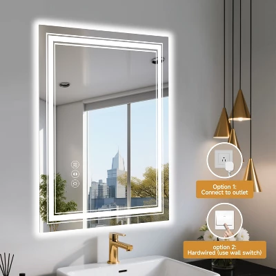 [Dimmable]: Long-press the power button to adjust brightness from 10% to 100%. Short-press the color temperature button to select 3000K warm white, 4500K neutral white, or 6000K daylight.[Unique Design]: Integrated mirror power switch and anti-fog button. The built-in anti-fog function eliminates the need for constant de-misting sprays. Anti-fog mode automatically shuts off after 1 hour for energy efficiency and safety.[Wall Switch Compatibility]: The wall switch can directly control the light and anti-fog functions. When power is restored via the wall switch after shutdown, the mirror resumes its last-used settings.[Safe & Durable]: UL-certified components with protective casing. LED lifespan: 50,000+ hours (45+ years at 3 hours daily use). Copper-free silver mirror with far lower corrosion rates than standard mirrors. Features 4mm tempered glass for shatterproof, explosion-resistant, and long-lasting safety.[Easy Installation & Packaging]: Improved packaging minimizes transport damage. Passed rigorous tests including drop, impact, high-voltage, and insulation tests. Includes mounting screws for effortless installation.Product Highlights