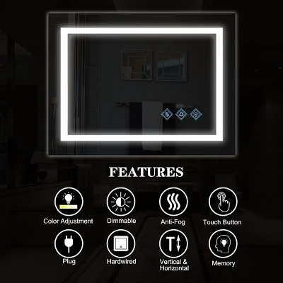 HD Bathroom MirrorWall-mounted bathroom mirror adopts HD float glass design to ensure 1:1 reproduction of the real image, providing clear reflection without distortion.Location ruler (Horizontal & Vertical)With a ruler, the mirror is easy to install. the stand is strong enough to support the weight of the mirror. bathroom mirrors can be hung vertically or horizontally.3000-6000K LED3000k (warm light), 4500k (natural light), 6000k (white light) are integrated in this LED mirror. The brightness can be adjusted.UL High QualityBathroom vanity mirror is made of UL certified electronic parts.50000+ hours long life LED strips.High quality, safe, durable and environmental.48x36inch Silver Rectangle Wall MirrorThe brightness can be adjusted, 3000-6000K LED. We hope this new design of Rectangle mirror will be beyond classic and add a sense of luxury to your room.(Please note: Our products only include mirrors, not cabinets!)