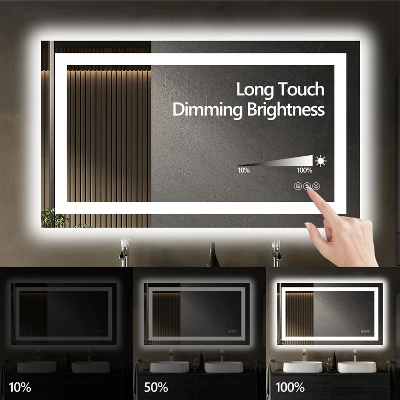 [Dimmable]: Long-press the power button to adjust brightness from 10% to 100%. Short-press the color temperature button to select 3000K warm white, 4500K neutral white, or 6000K daylight.[Unique Design]: Integrated mirror power switch and anti-fog button. The built-in anti-fog function eliminates the need for constant de-misting sprays. Anti-fog mode automatically shuts off after 1 hour for energy efficiency and safety.[Wall Switch Compatibility]: The wall switch can directly control the light and anti-fog functions. When power is restored via the wall switch after shutdown, the mirror resumes its last-used settings.[Safe & Durable]: UL-certified components with protective casing. LED lifespan: 50,000+ hours (45+ years at 3 hours daily use). Copper-free silver mirror with far lower corrosion rates than standard mirrors. Features 5mm tempered glass for shatterproof, explosion-resistant, and long-lasting safety.[Easy Installation & Packaging]: Improved packaging minimizes transport damage. Passed rigorous tests including drop, impact, high-voltage, and insulation tests. Includes mounting screws for effortless installation.Product Highlights