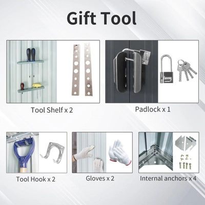 - [Gift Tool] Metal Foundation Frame,Anchors,Hooks,Shelf padlock,Gloves Easy-build shed made of Electro Galvanized Steel treated for strong corrosion resistance. UV resistant steel panels protect against rot, insects, and extreme weather conditions.