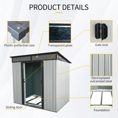 ¡¾Spacious Storage Tool Shed¡¿This 6 x 5ft outdoor shed provides impressive storage room for tools, equipment, and materials, which is perfect for backyard, garden, patio, utility weatherproof tool room. Keep your house and backyard tidy.¡¾Sturdy Outdoor Storage Room¡¿The outdoor tool shed is made with galvanized steel for strong CORROSION-RESISTANCE, UV-RESISTANT and MOISTURE-PROOF. It is suitable for all weather conditions and can be used all year round.¡¾Metal Foundation Frame¡¿The storage shed is equipped with metal Foundation frame, you only need to find some pieces of wood and put them on the foundation to keep your items away from the ground. Even in rainy days, your items will not get wet and rust.¡¾Ventilation & Waterproof Design¡¿This outdoor storage shed with inclined slope roof, add extra storage and prevents rain water from gathering and preventing from rust. And the 2 transparent panels allow sunlight to illuminate interior.¡¾Easy to assemble¡¿All panels and frames are pre-cut and perforated, you just need to assemble them together according to the numbered panels and accessories.