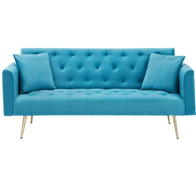 Weights DimensionsOverall – sofa71x19x30HSofa Bed71x38x24HSeat Height30Product Weight58.4 LBSGross Weight61.75 LBSCarton size66.22*39.19*6.84 H 61.75lbsProduct TypeSofa BedSeating Capacity2Upholstery MaterialPolyesterUpholstery ColourGreen, pink, beige, blue, grayLeg Material / ColorGoldenSeat Fill MaterialPolyesterBack Fill MaterialPolyesterFrame MaterialSolid + Manufactured WoodSeat ConstructionSolid wood +serpentine springPillows IncludedyesRemovable Cushion CoverNoWeight Capacity600LBProduct CareWipe clean with a dry cloth