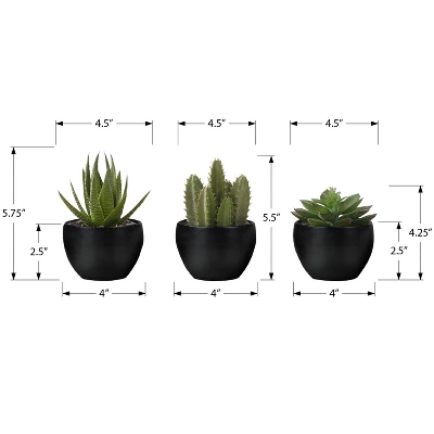 Add a touch of greenery to your home or office with this set of 3 artificial succulent plants that stand up to 6″ tall.Each artificial plant is potted up in a neutral melamine black pot with sand dressing on top, perfect for placing indoors on tables, shelves, or other flat surfaces.These easy-care faux green plants are made from the highest quality materials and require no maintenance or watering, for a sustainable, environmentally friendly decorative accents that will last a lifetime.Product dimensions: 4 in. L x 4.5 in. W x 5.75 in. H; 4 in. L x 4.5 in. W x 5.5 in. H; 4 in. L x 4.5 in. W x 4.25 in. H