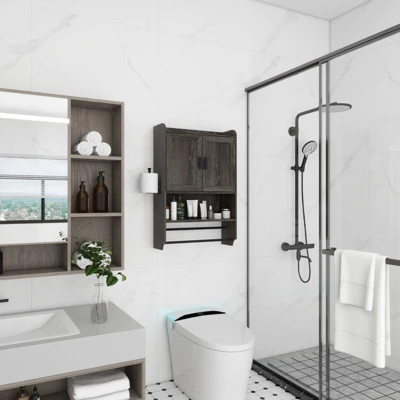 - Space-Saving: Suitable size and large capacity. Wall mounted design gives you deep storage without taking up extra space, open storage shelf saves your time, hidden design prevents dust and protect your privacy, keeping everything in order behind the doors with its spacious interior.Two towel racks are installed below the cabinet, and a paper rack is installed on the side to provide more storage space.