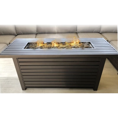 - Turn any chilly evening into a cozy warm night by huddling around this rectangle of steel fire pit table.