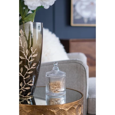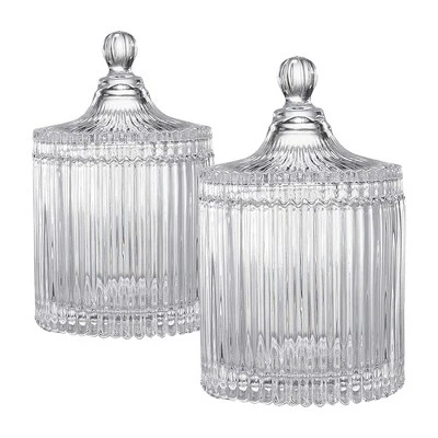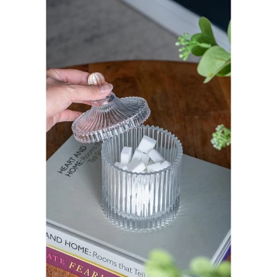 - The Ancell Lidded Glass Jar features a finial-topped lid that curves down into ribbed sides.