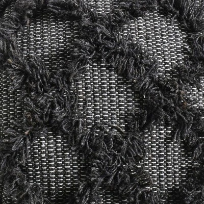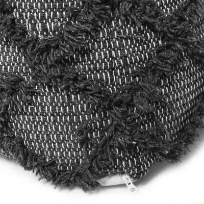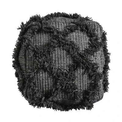 Material: Fabric Composition: Wool and Cotton.It is a one of a kind indoor Pouf.16x16x16 inches square.Capacity 200 pounds.Fully assembled.Filled with polystyrene beads.