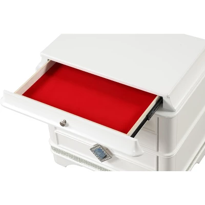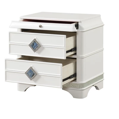 - Elegant Handles: Unique handles with a translucent blue marble center and crystal accents enhance the nightstand’s luxurious appeal.