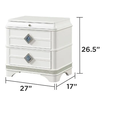 The drawers are adorned with distinctive handles, featuring a translucent blue marble center surrounded by sparkling crystal details, adding a touch of luxury to your bedroom decor.Laguna Nightstand:Enhance your bedroom with this elegant 2-drawer nightstand, which offers a perfect blend of functionality and style. Designed with convenience in mind, this nightstand features two spacious, soft-closing drawers that provide ample storage while ensuring a quiet and smooth closure, perfect for keeping your essentials within easy reach. Crafted from high-quality materials, this nightstand is built to last, making it a versatile and charming addition to any modern bedroom setup.Dimensions:44″W * 38″H * 1.5″L