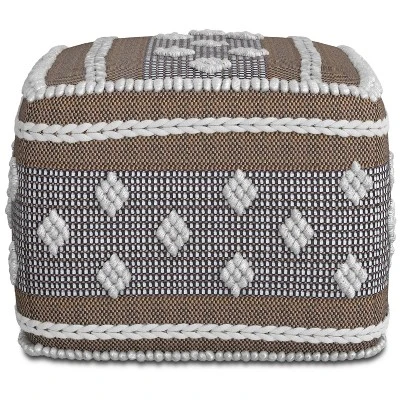 DIMENSIONS: 18inD x 18in W x 14in HHandcrafted with Handcrafted with 100% recycled PET woven polyester in a white, beige and grey patternSturdy and structured using dense polystyrene bead filling that helps keep its shape and is super supportiveMulti-functional can be used on your patio, deck, in your living room, family room, bedroom as a foot stool, accent furniture or provide additional sittingWater and UV Ray resistant, versatile square shape made of 100% recycled PET obtained from recycling of PET bottlesFully assembled