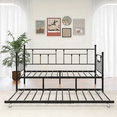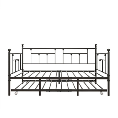 Metal Day Bed Frame with Twin Size Adjustable Trundle BedsAdjustable sofa bed frameSpace saving metal bed frameTrundle bed with wheelsComfortable sleeping area for guest or sleepoverSpecificationsDimensions77.72″ L x 40.35″ W x 41.73″ H (main bed); 74.01″ L x 37.6″ W (trundle) Weight: 63 lbs.Weight Capacity350 lbs. (main bed); 250 lbs. (trundle)MaterialMetalColor OptionsBlackMattress SizeTwin (mattresses not included)